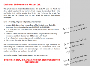 Hab mal wieder ne Geldwäsche-Mail bekommen Veröffentlicht am 9. August 2014 von admin Gibt ja immer noch genug Leute die auf sowas reinfallen. Sei es aus Dummheit, Gier oder Not. (Per E-Mail)